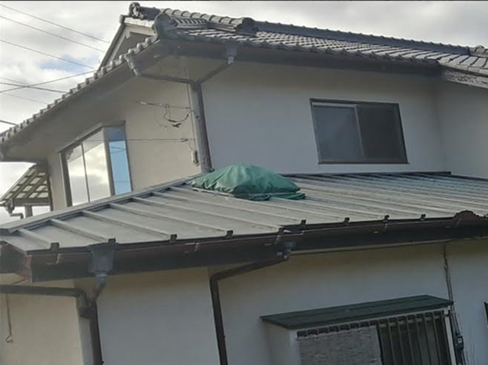 一部屋根が捲れ雨水が侵入、お客様が大工さんに頼み一時的にブルーシートを貼り固定した状態。