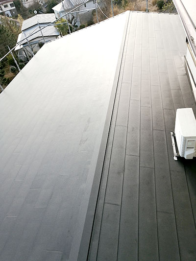 完了です、ガリバリウム鋼板屋根材の表面は焼付塗装をしており光沢もあり美しい仕上がりです。