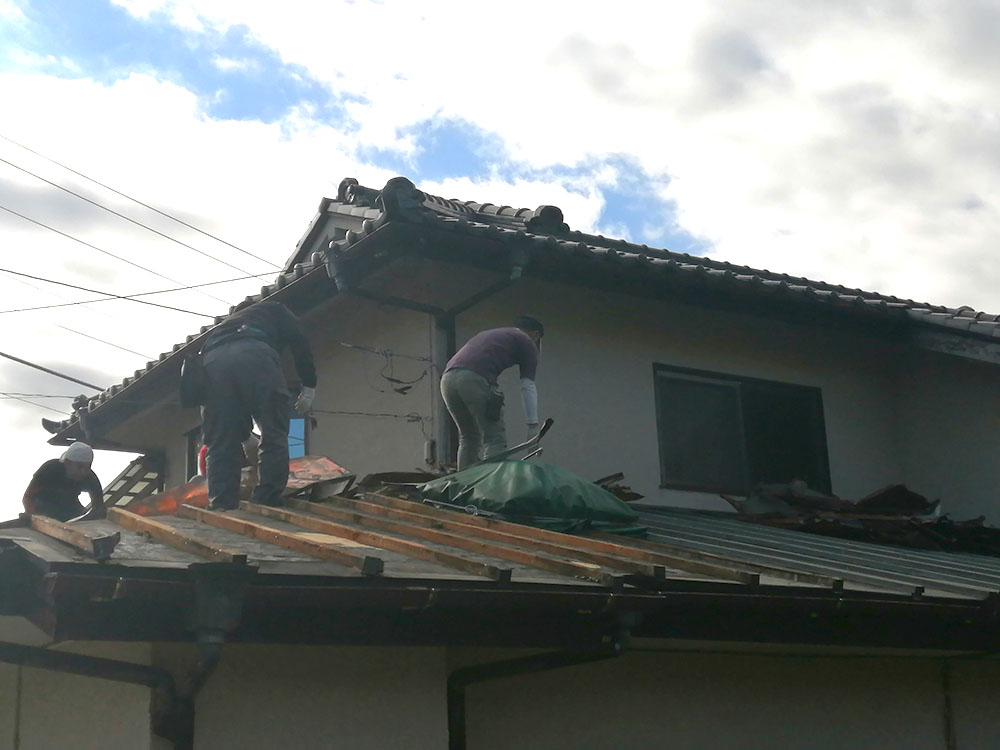 突風で一部野地板ごと飛ばされてしまい建物内に雨水が侵入。