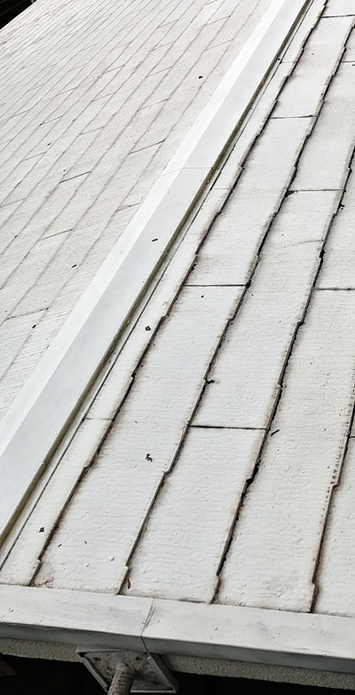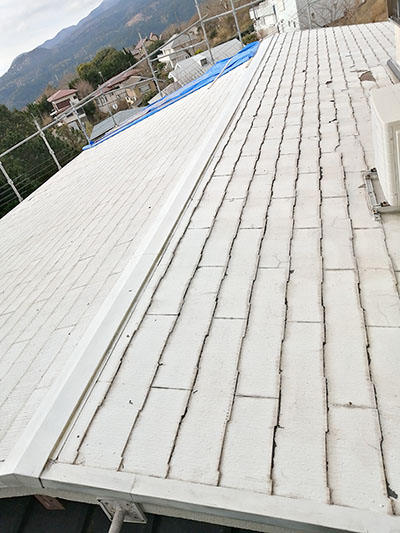 一室雨漏りが発生、コロニアル無数の割れ、白くなり色褪せもすすんでいる状況でした。