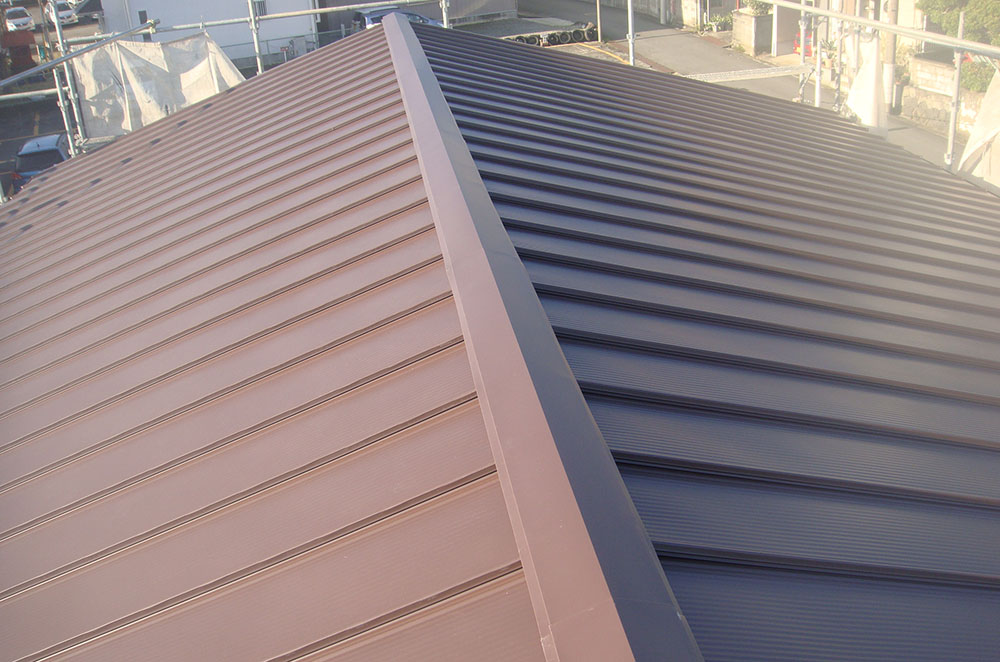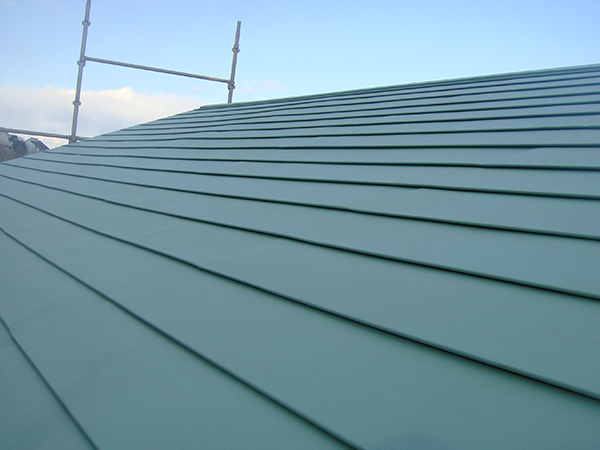 完了です、ガリバリウム鋼板屋根材の表面は焼付塗装をしており光沢もあり美しい仕上がりです。