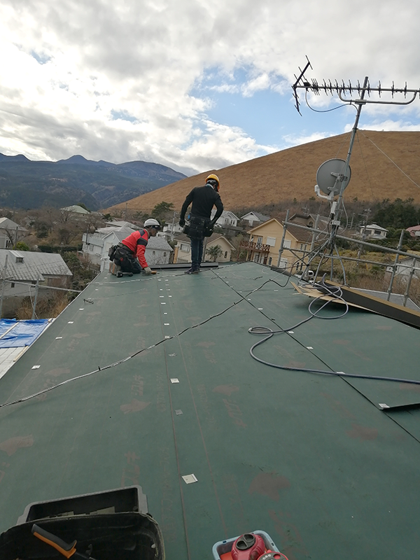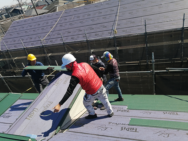 ルーフィング工作業風景。瓦の重なる段差がでないように接合方式で行います。