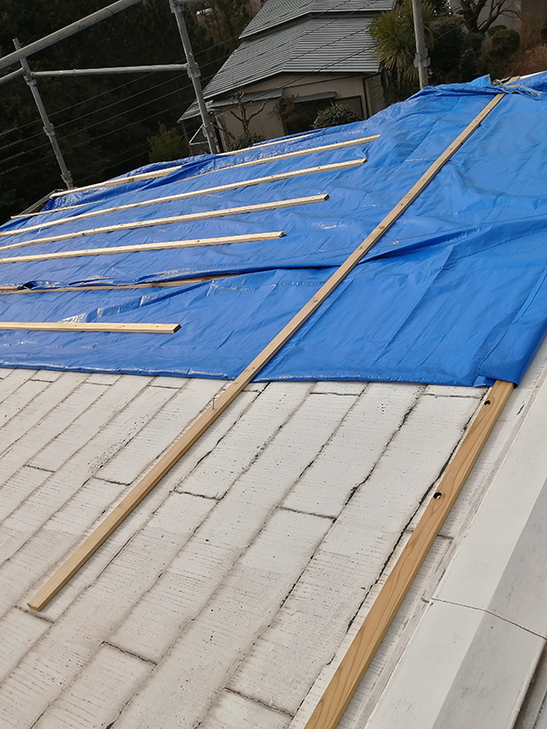 一部屋根が捲れ雨水が侵入、お客様が大工さんに頼み一時的にブルーシートを貼り固定した状態。